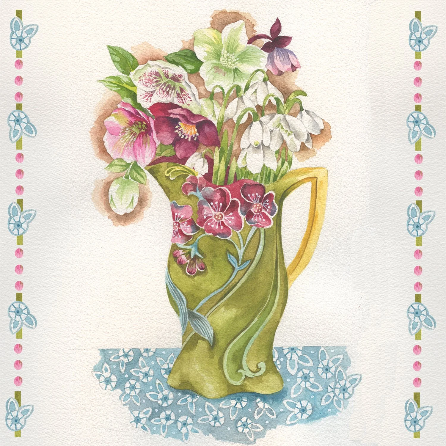 Hellebores and Snowdrops in Majolica Vase